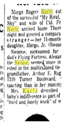 Kurtz’s wife, Margo Rogers Kurtz, was the pride of Omaha, born there (as was Swoosie) and married there. Margo, an author, could fly a plane solo and toured with Hollywood celebrities to support the war effort. She lived to 103½.