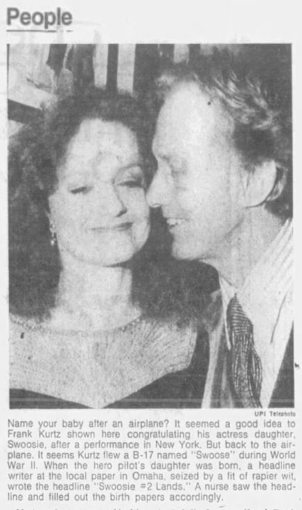 From clips of the Omaha World-Herald of 1944 and 1945, it appears the happy parents-to-be decided well in advance what they would call their baby daughter — “The Little Swoose.” It looks like “Swoosie” is what stuck. (It seems like her official name might be more along the lines of “Margo Jr.,” but that’s beside the point.) (It also seems like the Chicago Tribune caption above of April 5, 1978, may be taking artistic license with some details.) The name is cute. It’s not a show-business creation. It’s a tribute to The Greatest Generation.