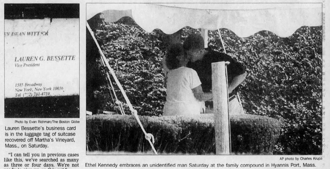 Lauren Bessette, who worked in the investment-banking division at Morgan Stanley Dean Witter, headed to the George offices to ride with Kennedy to the Essex County Airport in Fairfield, N.J., in his white Hyundai convertible. Lauren arrived at the office around 6:30, “and staff members say there was no indication that either she or Kennedy was running late.” Some at her office had seen her carrying a black garment bag, apparently the one that “would wash up on the beaches of Martha's Vineyard.” The Chicago Tribune reported on Sunday, July 18, that luggage with Lauren Bessette’s tag included “a hair dryer and women’s clothing.”