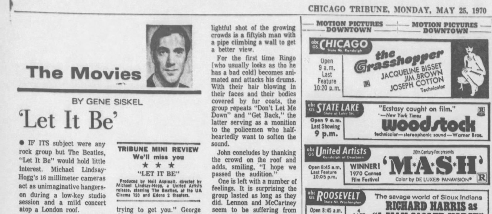 In the May 25, 1970, edition of the Chicago Tribune, Gene Siskel gave “Let It Be” 3 stars and noted it “may be the last public appearance of Paul McCartney, John Lennon, George Harrison and Ringo Starr, the most culturally-influential musicians of this century.” Siskel writes that “the most interest” is a “minor hassle” between George Harrison and Paul McCartney. Siskel writes that McCartney and Lennon “harmonize once during the film, and it is the most electric moment in the 80 minutes.”