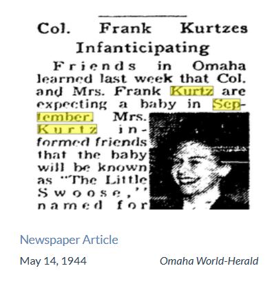 From clips of the Omaha World-Herald of 1944 and 1945, it appears the happy parents-to-be decided well in advance what they would call their baby daughter — “The Little Swoose.” It looks like “Swoosie” is what stuck. (It seems like her official name might be more along the lines of “Margo Jr.,” but that’s beside the point.) (It also seems like the Chicago Tribune caption above of April 5, 1978, may be taking artistic license with some details.) The name is cute. It’s not a show-business creation. It’s a tribute to The Greatest Generation.